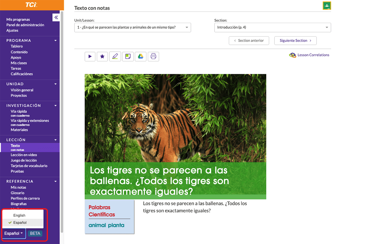 Want your dual immersion learners to master key concepts and easily switch between Spanish and English? With our new Spanish Immersion View feature, you and your students will be able to view all TCI program content in Spanish, including the navigation, labels, and buttons.